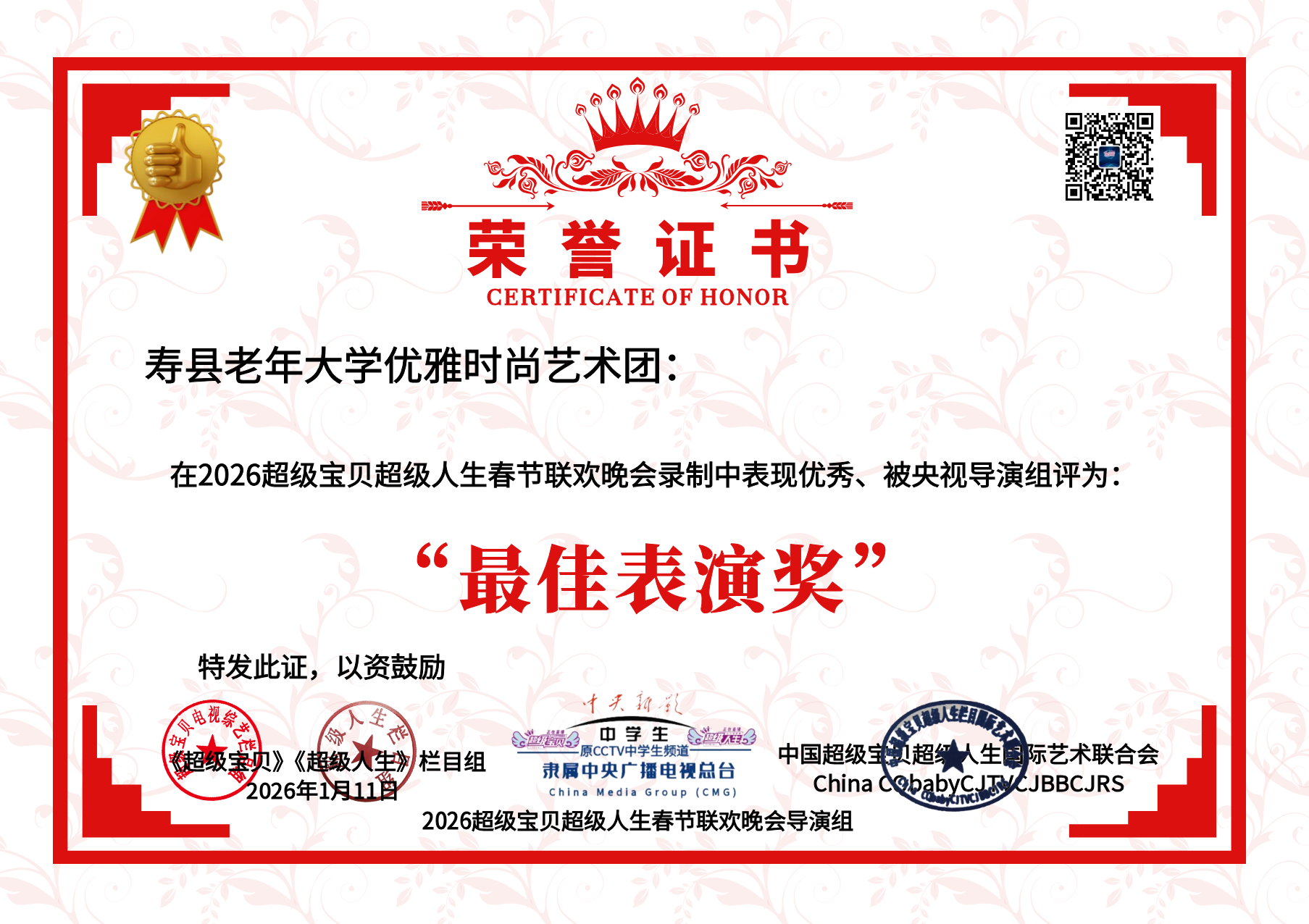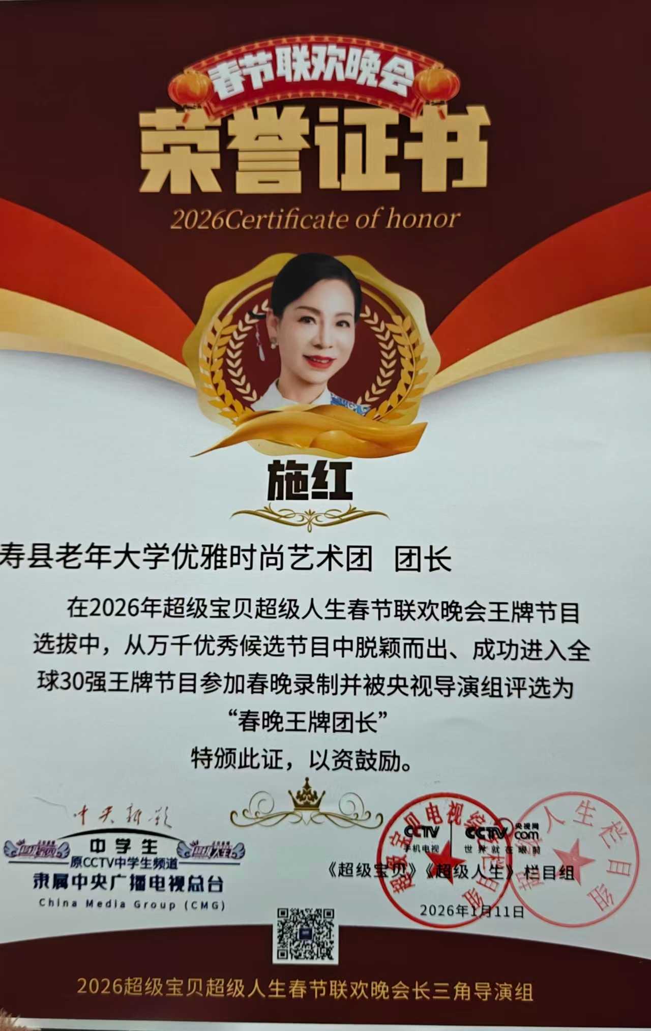 —寿县老年大学优雅时尚艺术团央视春晚录制获奖