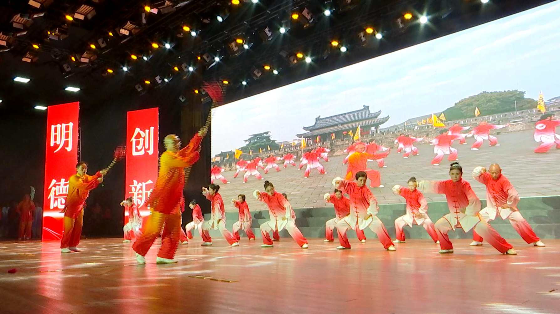 银龄筑梦新时代,桑榆生辉颂华章。铿锵的鼓点、挥动的鼓槌,欢快热烈的寿州锣鼓《楚韵流芳》,瞬间点燃全场激情。《陈氏太极武术串烧》与《健身气功》刚柔相济,于一招一式尽显古城底蕴,生动诠释了中华传统武术的魅力。陈如海、陈姗姗伉俪领衔表演的交谊舞《一条小河》舞步优雅,体现了老年朋友追求健康生活的新风尚。歌舞《甘南草原美》《太阳姑娘》及手鼓表演《苹果香》,则展示出浓郁的少数民族风情,绘就了中华民族团结一心、命运与共的生动图景。